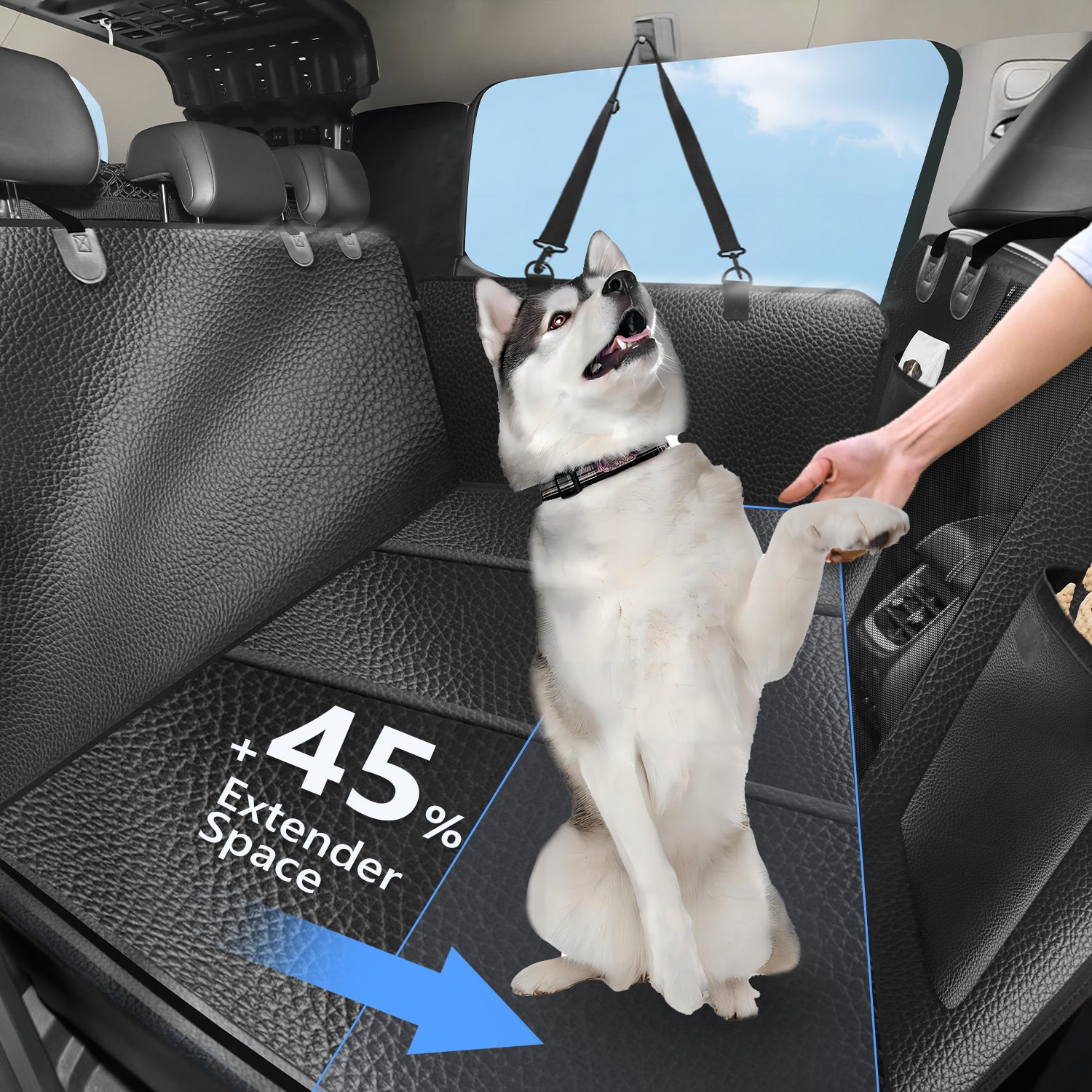 【100% WATERPROOF, PROTECT BACKSEAT CLEAN & ANTI-SCRATCHING】 ROUWINNE waterproof seat extender for dogs can cover the whole back and surround, both front and back seats, bottom, and sides of both doors can be protected in place. Keeps your backseat cleaner and tidier and prevents scratches and abrasions on the back seat, no need to worry about your dog's hair, slobber and claws. This back seat pet cover for dogs also makes it easier to place items in the original foot space area.