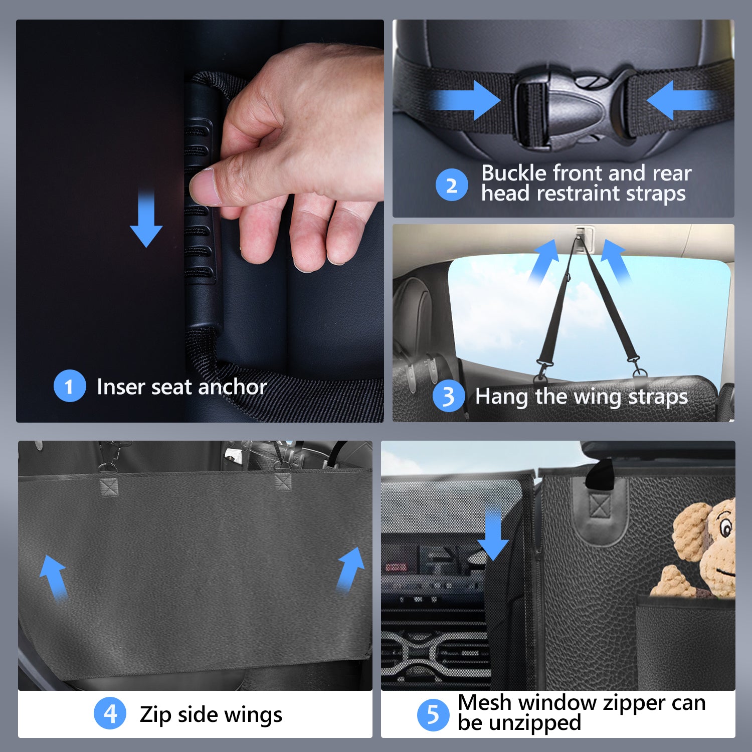 【MESH WINDOW, THICKENDE WEBBING & STORAGE POCKETS】 ROUWINNE Dog Backseat Extender has a mesh window for more breath ability, allows your dog to see you and reduce anxiety. The mesh window is also equipped with non-slip zippers on both sides, through which you can also interact with your dog. The encrypted and wider webbing latch is more sturdy, and this dog back seat extender also has two large capacity storage pockets to put your dog's toys and snacks in. Take your dogs on a safe trip!